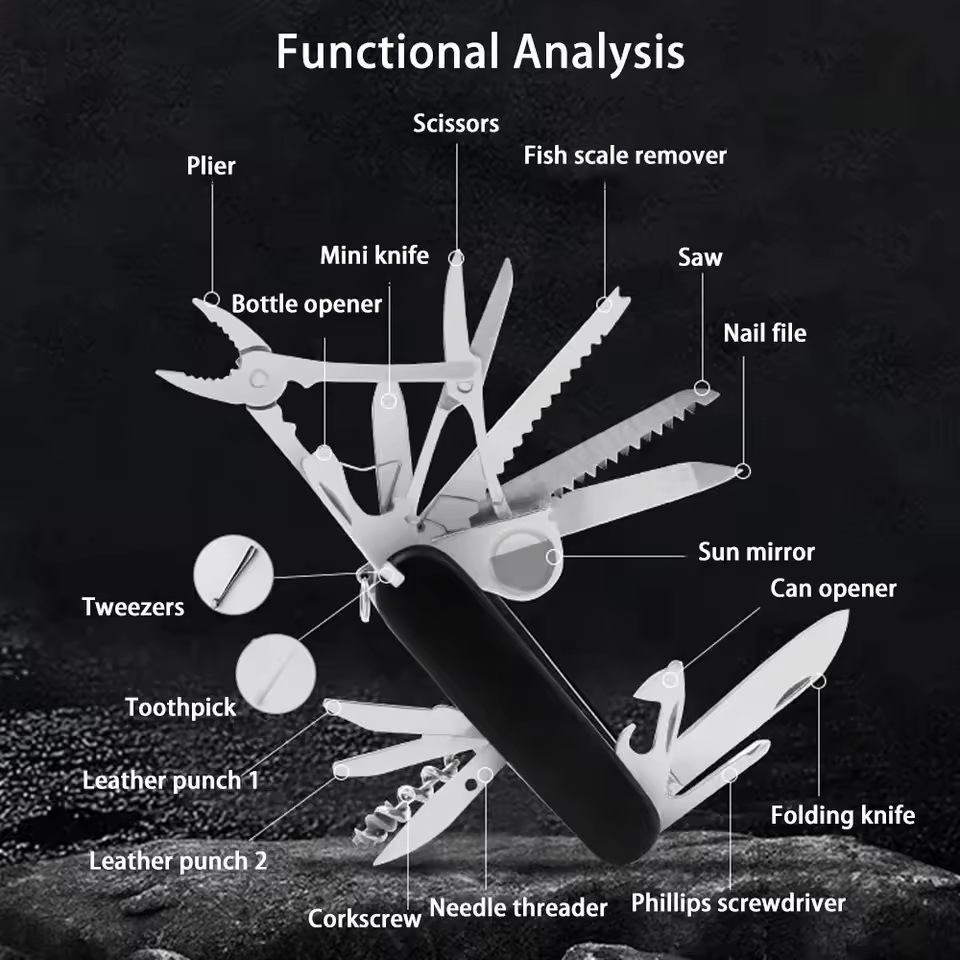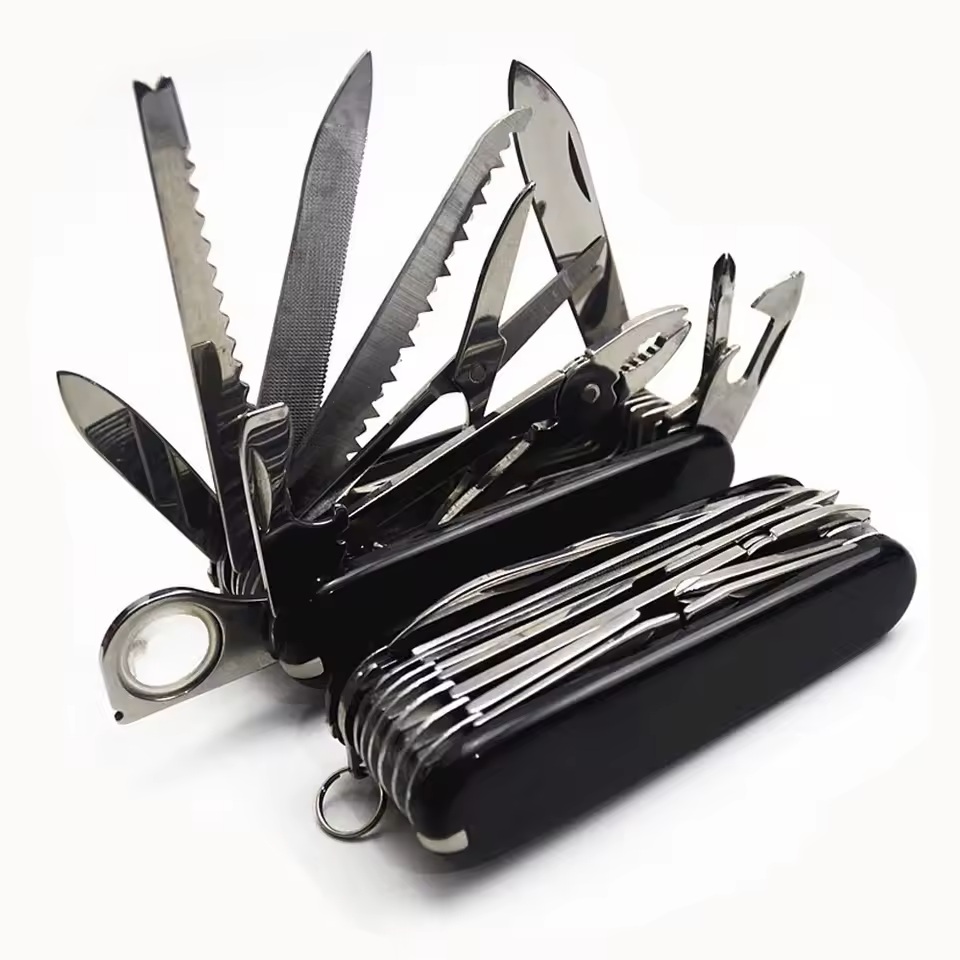 Multiherramienta 30 en 1: cuchillos grandes y pequeños, sacacorchos, abrelatas, destornillador pequeño, alicate, tijeras, sierra, lima, y mas.